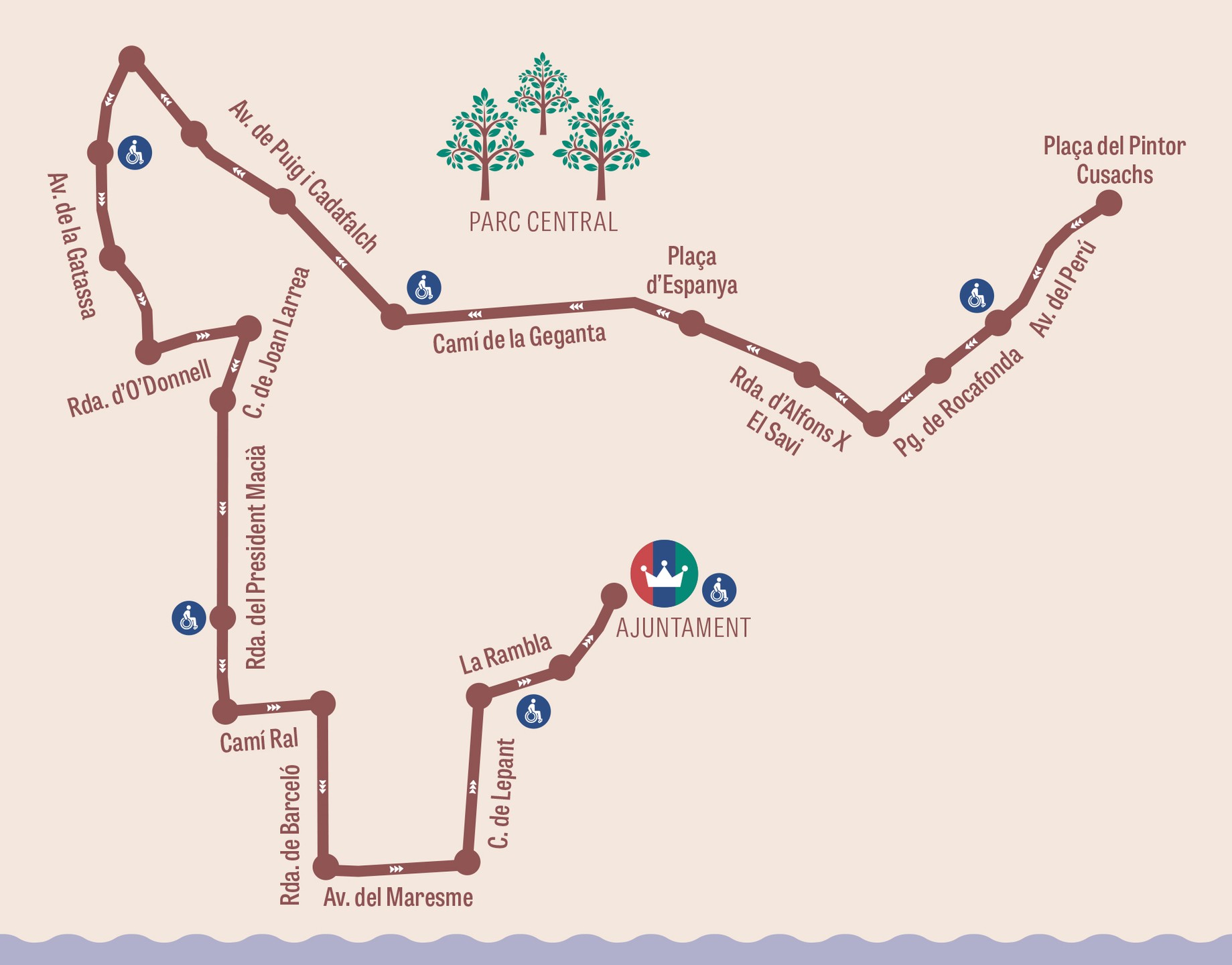 Recorregut de la Cavalcada: pl. del Pintor Cusachs, av. del Perú, pg. de Rocafonda, rda. d’Alfons X el Savi, pl. d’Espanya, camí de la Geganta, av. de Puig i Cadafalch, av. de la Gatassa, rda. O'Donnell, c. de Joan Larrea, rda. del President Macià, camí Ral de la Mercè, rda. de Barceló, av. del Maresme, c. de Lepanto, la Rambla i la Riera fins a l'Ajuntament.